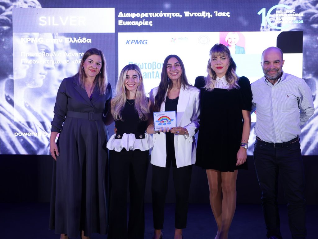 Σε ένα ιδιαίτερα γιορτινό κλίμα στα φετινά Hellenic Responsible Business Awards 2025, η KPMG στην Ελλάδα διακρίθηκε με Χρυσό και Ασημένιο βραβείο για την πρωτοβουλία Κοινωνικής Υπευθυνότητας “AdvantAge”, στις κατηγορίες «Συμβουλευτικές Υπηρεσίες» και «Διαφορετικότητα, Ένταξη, Ίσες Ευκαιρίες» αντίστοιχα. Οι διακρίσεις αυτές επιβεβαιώνουν τη δέσμευση της KPMG στην προώθηση της ισότητας και της συμπερίληψης και στη δημιουργία ενός πιο δίκαιου και χωρίς αποκλεισμούς εργασιακού περιβάλλοντος, μέσω της ευαισθητοποίησης της επιχειρηματικής κοινότητας και της κοινωνίας για τον ηλικιακό ρατσισμό στην αγορά εργασίας και της υλοποίησης δράσεων που προάγουν ίσες ευκαιρίες απασχόλησης ανεξαρτήτως ηλικίας.