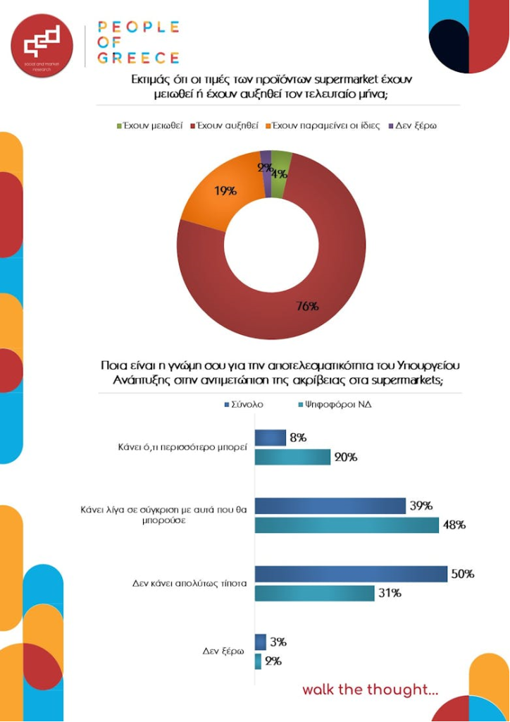 - Τρεις στους τέσσερις Έλληνες βλέπουν αυξήσεις στις τιμές του supermarket, παρά τις κυβερνητικές ανακοινώσεις περί μειώσεων, ενώ εννέα στους δέκα θεωρούν ότι το κράτος “δεν κάνει αρκετά”. Το τραύμα της δεκαετούς οικονομικής κρίσης, δύσκολα θα αντισταθμιστεί με τακτικά μέτρα κατά της ακρίβειας.