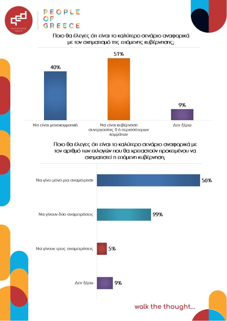- Η προτίμηση για κυβέρνηση συνεργασίας πιθανώς μαρτυρά κόπωση από τις μονοκομματικές λογικές και επιθυμία για συναινετικότερη πολιτική κουλτούρα, ωστόσο είναι επίσης πιθανό ότι το εκλογικό σώμα δεν αντιλαμβάνεται, σε αυτήν τη χρονική στιγμή, ως ισχυρό το εκλογικό διακύβευμα της ακυβερνησίας.