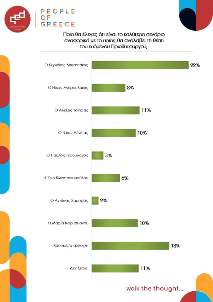 - Οι Έλληνες εμφανίζονται πολιτικά απογοητευμένοι και χωρίς σαφή προτίμηση ηγεσίας. Ο Κυριάκος Μητσοτάκης παρότι πρώτος, έχει σχετικά χαμηλά ποσοστά αποδοχής ως “καλύτερο σενάριο πρωθυπουργού” (22%). Ο Αλέξης Τσίπρας παραμένει αναγνωρίσιμος αλλά όχι πειστικός εναλλακτικός πόλος. Η παρουσία άλλων προσώπων (Δένδιας, Καρυστιανού) δείχνει αναζήτηση νέων, πιο “ουδέτερων” ή “λιγότερο φθαρμένων” προσώπων.