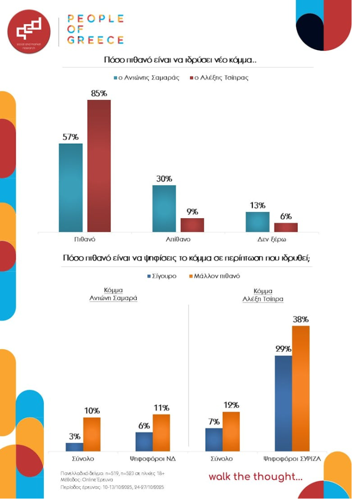 - Συγκρίνοντας τις δύο εν δυνάμει κινήσεις ίδρυσης κομμάτων, από τον Αλέξη Τσίπρα και από τον Αντώνη Σαμαρά, τόσο στο σύνολο όσο και στο πολιτικό τους ακροατήριο, η δυναμική του Αλέξη Τσίπρα είναι σαφώς μεγαλύτερη και μπορεί να λειτουργήσει ως διέξοδος για τους οπαδούς του ΣΥΡΙΖΑ, ενώ η υποψηφιότητα Αντώνη Σαμαρά μάλλον λειτουργεί ως σενάριο διάσπασης στον χώρο της ΝΔ.