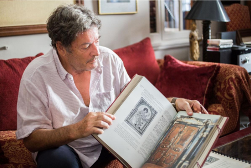 Ο Κωνσταντίνος Σπ. Στάικος με την «Ιστορία της Βιβλιοθήκης» στο σπίτι του στην οδό Μουρούζη.