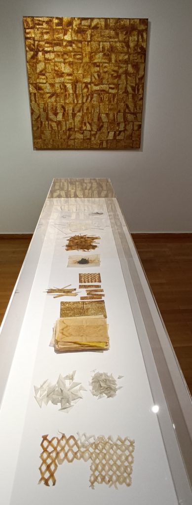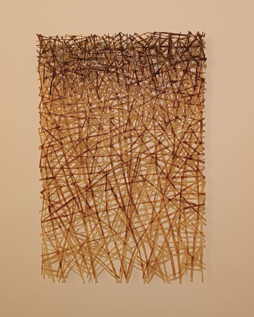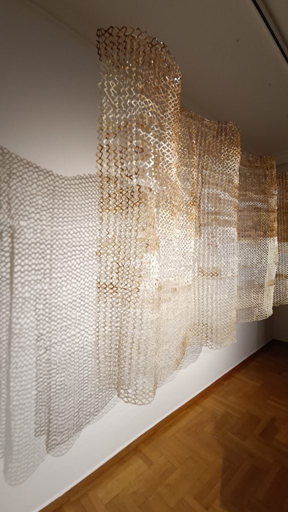 Τα μοτίβα και οι υφές των έργων θυμίζουν κελύφη, τοπία ή επιδερμίδες, σχηματίζοντας περιβάλλοντα φωτεινών αντανακλάσεων και σκιών. Ο θεατής περιηγείται σε μια μεταιχμιακή εμπειρία, όπου η ελαφρότητα και η αιχμηρότητα συνυπάρχουν σε μια παράδοξη, μαγευτική ισορροπία.