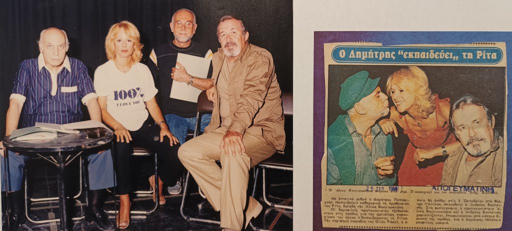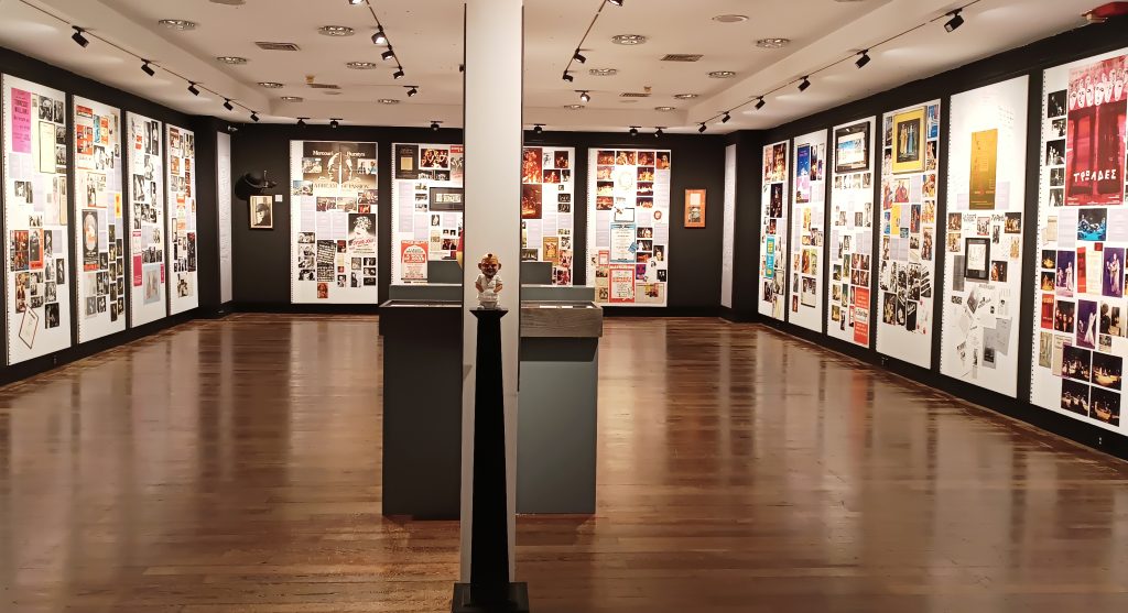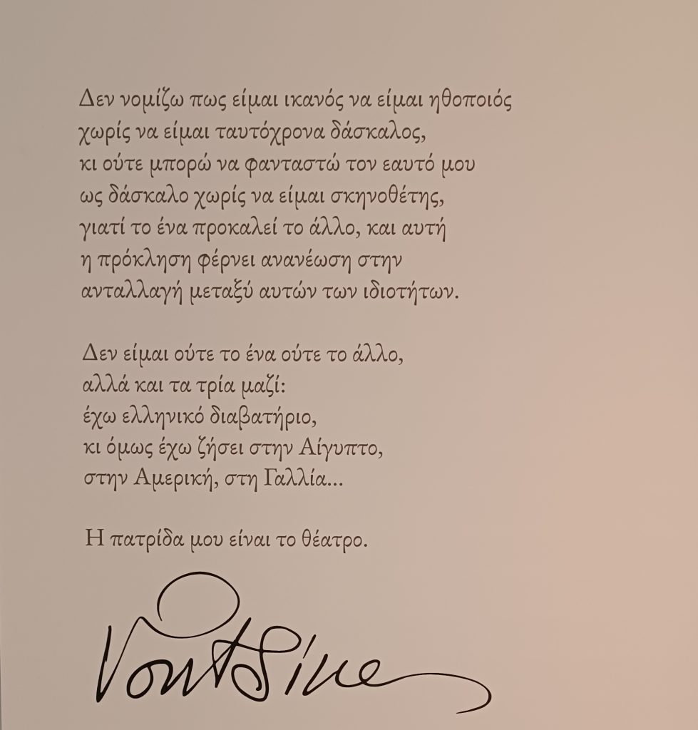 Από το Actors Studio και το Μπρόντγουεϊ, μέχρι το Παρίσι του ’68 και την Επίδαυρο, η διαδρομή του φωτίζεται μέσα από μακέτες, σχέδια, φωτογραφίες, προγράμματα και σπάνια ντοκουμέντα. Εκεί αναβιώνουν συνεργασίες με ιστορικές μορφές του ελληνικού θεάτρου – Δέσπω Διαμαντίδου, Μελίνα Μερκούρη, Ειρήνη Παππά, Αλεξάνδρα Λαδικού, Νόνικα Γαληνέα, Αλίκη Βουγιουκλάκη – αλλά και νεότερες ηθοποιούς που σημάδεψε με τη διδασκαλία του, όπως η Καρυοφυλλιά Καραμπέτη και η Λυδία Φωτοπούλου.