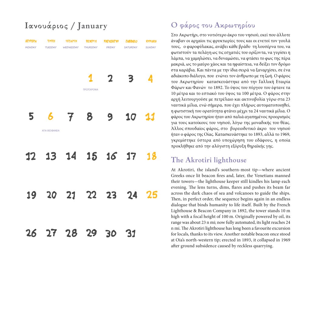 Κομβικό ρόλο σε αυτή την αφήγηση παίζουν τα κείμενα που συνοδεύουν κάθε μήνα του ημερολογίου. Δεν λειτουργούν απλώς ως λεζάντες, αλλά ως μικρές αφηγηματικές μονάδες που γεφυρώνουν το παρελθόν με το παρόν, προσκαλώντας τον σημερινό αναγνώστη να αναμετρηθεί με όσα έχουν χαθεί, όσα επιβιώνουν και όσα αλλοιώθηκαν. Ο φάρος του Ακρωτηρίου, με τον οποίο ανοίγει ο χρόνος, υπενθυμίζει την ανάγκη προσανατολισμού σε έναν τόπο που σήμερα φωτίζεται περισσότερο από τα φλας της προβολής παρά από το φως της ανάγκης. Οι μικρές υφάντρες και η σχολή ταπητουργίας φέρνουν στο προσκήνιο την αξία της εκπαίδευσης, της χειρωναξίας και της τοπικής γνώσης, σε αντίστιξη με τη σύγχρονη αποσύνδεση από την παραγωγή.