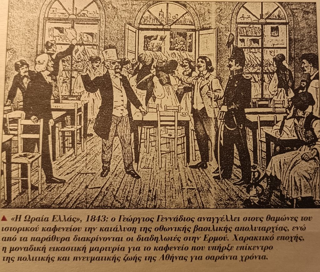Λίγα χρόνια μετά την «Ωραία Ελλάδα», στην καρδιά της νέας πρωτεύουσας, στην πλατεία Συντάγματος, αναδείχθηκαν καφενεία που δεν ήταν απλώς χώροι κατανάλωσης καφέ, αλλά σκηνές επίδειξης αστικής πολυτέλειας και ταυτόχρονα θερμοκοιτίδες πολιτικής και πνευματικής ζωής.