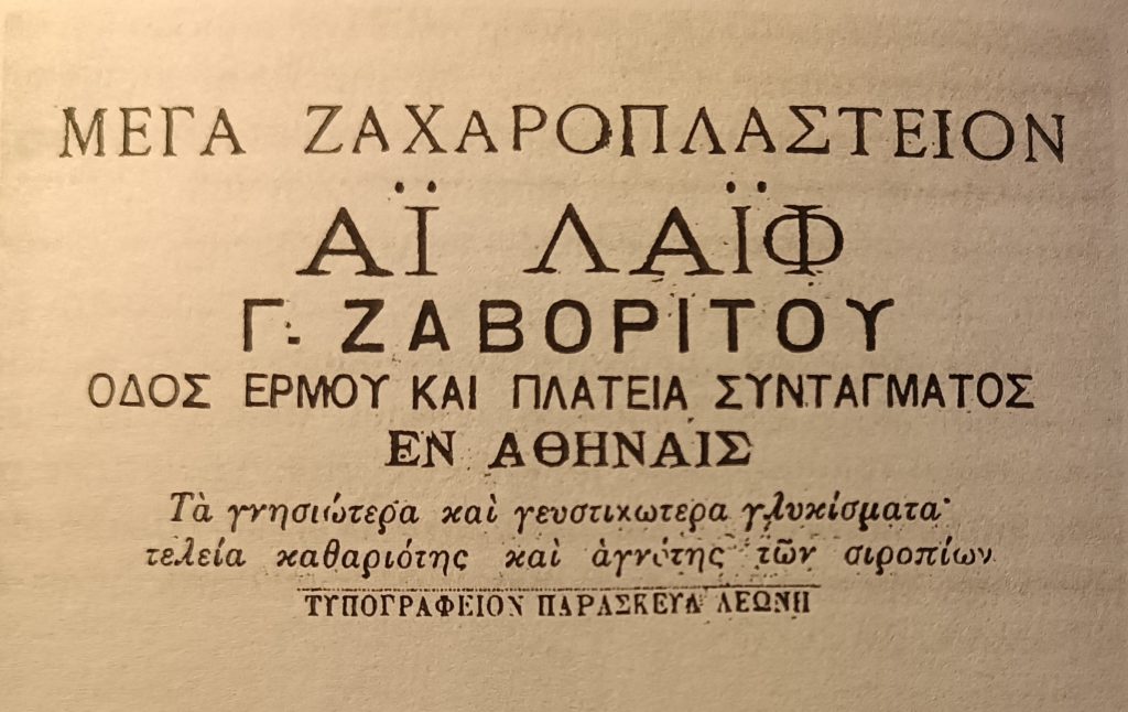 Το ζαχαροπλαστείο του Ζαβορίτη, στο ισόγειο του Μεγάρου Κορομηλά (πλ. Συντάγματος & Ερμού 1)
